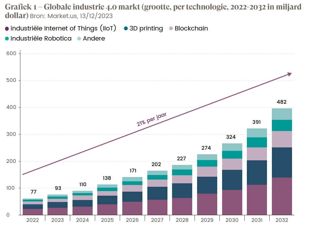 Om dit containerbegrip duidelijk te onderscheiden van andere door ons gedefinieerde thema’s (zoals digitale connectiviteit) focussen we ons binnen deze industrie 4.0 vooral op de automatisering (IIoT), robotisering en 3D printing. Zoals blijkt uit onderstaande grafiek wordt deze markt verwacht te groeien aan een jaarlijkse groeivoet van 21%.