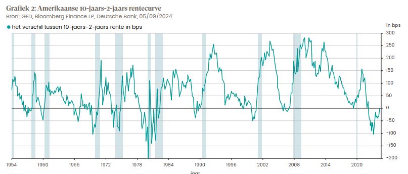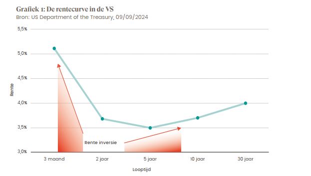 De tegenvallende economische cijfers in augustus waren voor veel beleggers het teken dat ook de VS niet van een recessie gespaard zou blijven, wat beleggers massaal naar obligaties deed vluchten. Voor het eerst in 25 maanden kwam zo de 2 jaars-rente terug in de buurt van de 10 jaars-rente (grafiek 1). De hoop wakkerde immers aan dat de centrale banken de rente in september 2024 zouden verlagen, wat intussen ook gebeurde. Voor de ECB betekende dit een tweede verlaging met 0,25% terwijl het voor de FED pas de