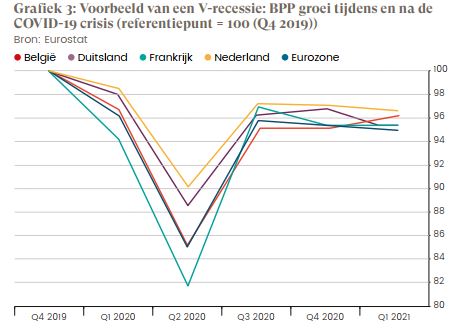Hoe dan ook kan een recessie nooit met 100% zekerheid vermeden worden. Recessies bestaan echter in vele vormen en groottes en de impact ervan op de economie kan soms relatief beperkt blijven. Dit type recessie wordt ook wel een V-recessie genoemd omdat de economie op relatief korte tijd terugveert naar het niveau van vóór de recessie, en zo dus een V-vorm heeft (zie grafiek 3). Een V-recessie kan voor beleggers zelfs opportuniteiten bieden omwille van tussentijdse correcties op de beurs. In het geval van een V-recessie is het daarom vooral belangrijk om kalm te blijven en geen posities overhaast te verkopen.