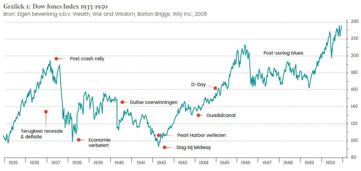De beursevolutie van verschillende landen betrokken in WOII weerspiegelt het sentiment tijdens de oorlog. Zo zien we op grafiek 1 de evolutie van de Amerikaanse Dow Jones index van 1935 tot 1950. In 1940 kreeg deze een zware tik na Duitse overwinningen, maar na de Amerikaanse overwinning bij de slag om Midway1 – wat gezien werd als belangrijk keerpunt – zien we een fors herstel, dat na D-Day verder in een stroomversnelling kwam. Wie bij het begin van de oorlog uit de markt stapte, liep dus wellicht ook een groot deel van- het herstel mis.