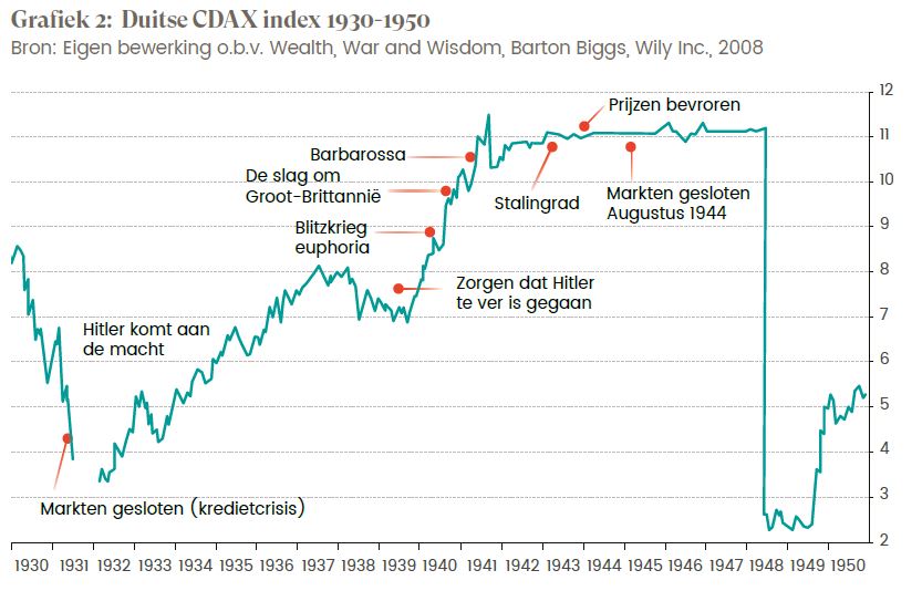 Op grafiek 2 is de evolutie van de belangrijkste Duitse index tussen 1930 en 1950 zichtbaar. Toen Hitler aan de macht kwam, was er aanvankelijk een sterke stijging van deze index, die dan nog eens versterkt werd door de euforie rond het succes van de Duitse blitzkrieg. Het succes bleef echter niet duren en in 1944 sloot de Duitse beurs. In 1948 opende deze beurs opnieuw en werden de koersen gedecimeerd. Het illustreert dat beleggen in het verliezende kamp weinig lucratief is.
