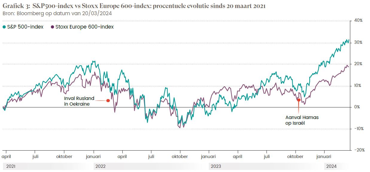 Helaas hoeft men niet ver in de geschiedenis te duiken om andere voorbeelden te vinden van geopolitieke spanningen en oorlogen. De inval van Rusland in Oekraïne vorig jaar lijkt verder te escaleren, met steeds grotere internationale inmenging. Ook in het Midden-Oosten lijkt een staakt-het-vuren nog heel veraf. Maar wat was nu de initiële impact van deze conflicten op de beurzen? Bij de S&P 500 was er in de dagen na de Russische inval een correctie zichtbaar van ruim 7%. Nog geen maand later werd dit verlies echter ruimschoots goedgemaakt. Bij de aanval van Hamas op Israël was er initieel zelfs geen negatieve reactie van de S&P 500. Vrij snel volgde toch paniek, met een paradoxale uitkomst. Beleggers vluchtte naar -veilig- Amerikaans staatspapier. Hierdoor daalde de rente, wat in een markt die in de ban was van stijgende rente, een positieve koersbeweging teweegbracht. In Europa waren de koersreacties, gemeten door de brede Stoxx Europe 600 index, quasi analoog: na de aanval van Rusland kende de markt een correctie maar het herstel kwam ook hier snel. Ook de reactie op de aanslagen van Hamas was aanvankelijk positief, opnieuw vooral gedreven door de allesbepalende rente-omgeving (zie grafiek 3).