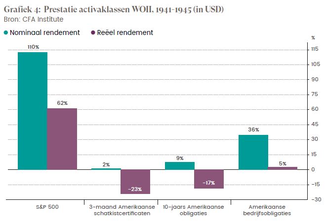 In tijden van grote onzekerheid wordt de vraag naar ‘veilige havens’ natuurlijk heel wat groter. Maar wat zijn dan die veilige havens? We werpen opnieuw een blik op WOII, gevolgd door de conflicten in Oekraïne en Israël. Op grafiek 4 is het rendement van enkele activaklassen tussen 1941 en 1945 zichtbaar, zowel nominaal als reëel (d.w.z. na inflatie). Aandelen, vertegenwoordigd door de S&P 500, leverden tijdens deze oorlogsjaren een reëel rendement van liefst 62% op. Voor velen wellicht contra-intuïtief maar obligaties deden het véél minder goed. Zowel het kort- als langlopend Amerikaans staatspapier leverde na inflatie een negatief rendement. Enkel de Amerikaanse bedrijfsobligaties leverden een positief reëel rendement van 5% op. Omdat oorlog historisch heel vaak gepaard gaat met verhoogde inflatie, is dit zeker niet verwonderlijk. Hogere inflatie gaat namelijk gepaard met hogere rente wat dan weer leidt tot lagere obligatiekoersen.