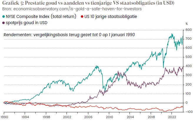 Wie veilige havens zoekt, denkt wellicht ook aan goud. Alhoewel de prestatie van goud afhankelijk is van tal van factoren, zien we historisch meermaals een sterke prestatie wanneer de geopolitieke spanning toeneemt. De eerste twee maanden van 2022 – de aanloop naar de inval van Rusland in Oekraïne – steeg de goudprijs met ongeveer 10%. Daarna startte een negatieve koersbeweging die aanhield tot het einde van het jaar, waardoor de initiële winst ruimschoots verloren ging om dan sinds 2023 weer stevig te herstellen (zie grafiek 5). De laatste jaren is de capaciteit van goud om als veilige haven te fungeren bijgevolg moeilijk te beoordelen. Goud is namelijk een activaklasse die geen opbrengst geeft. Goud veert weliswaar op bij geopolitieke spanningen maar is ook sterk onderhevig aan rentebewegingen: wanneer er nauwelijks rente is, is de kostprijs om goud aan te houden zeer klein, wanneer de rente echter fors stijg en men terug meer beloond wordt om zijn geld te parkeren in veilige obligaties, heeft dit in eerst instantie vaak een negatieve impact op de prijsevolutie van goud. Op lange termijn blijkt goud wel goed in staat om het inflatiepeil mee te volgen.