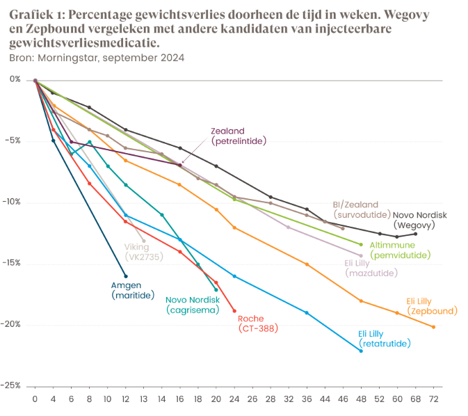 Grafiek 1 geeft een overzicht van voorlopige resultaten van nieuwe medicijnen die in ontwikkeling zijn in vergelijking met Wegovy en Zepbound.