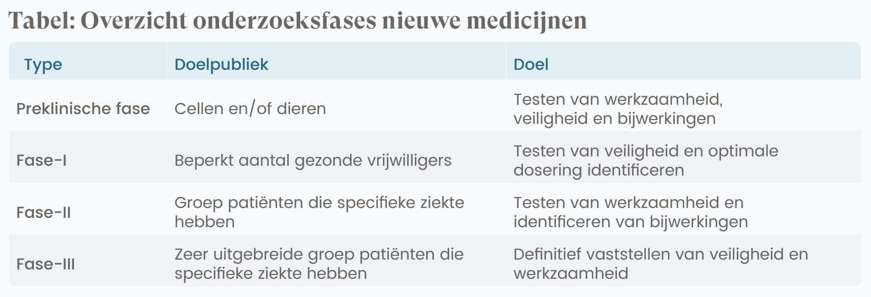 De gemiddelde tijd tussen de ontwikkeling van een molecule en de effectieve lancering van het medicijn op de markt schommelt tussen 10 en 15 jaar. Doorheen het proces moet het medicijn een aantal kritieke fases doorlopen zoals beschreven in onderstaande tabel: