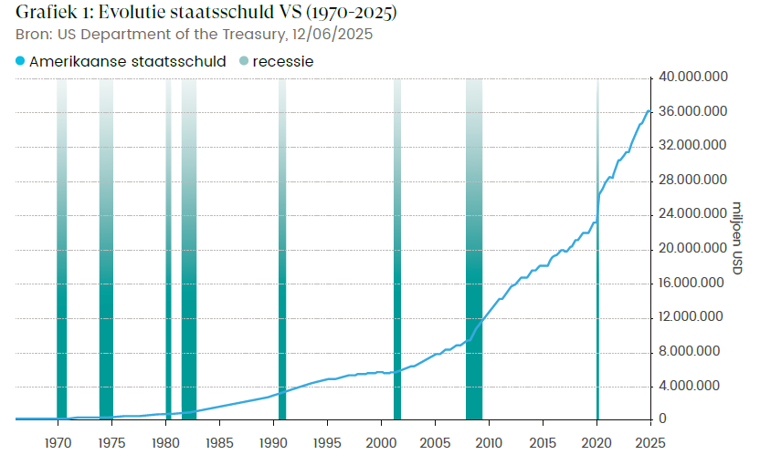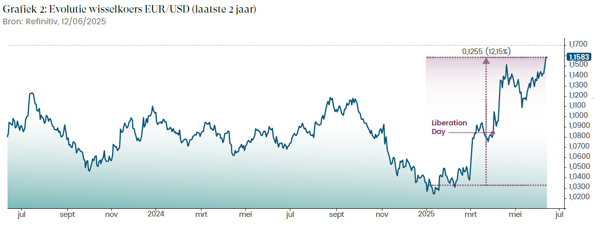 Grootste slachtoffer van heel de tariefsaga is tot nu toe de Amerikaanse dollar (zie grafiek 2). Sterkere economische prestaties buiten de VS, vooral in China en Europa, hebben de vraag naar de dollar verminderd, aangezien investeerders kapitaal verplaatsen buiten de Verenigde Staten. De wisselkoers van de USD ten opzichte van de EUR is sinds 1 januari 2025 met bijna 12% (op datum van 12 juni 2025) gedaald. Deze devaluatie van de USD weegt op de beursresultaten, uitgedrukt in euro.
