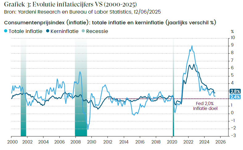 Er is opnieuw frictie tussen Trump en de Federal Reserve. Terwijl Trump lagere rente wil om groei te stimuleren, wil de Fed wachten vanwege inflatiezorgen. De huidige inflatie lijkt onder controle (2,4% in juni), maar nieuwe tarieven kunnen later in 2025 alsnog prijsdruk veroorzaken. Het monetaire beleid blijft dus onzeker en sterk afhankelijk van de evolutie van inflatie en werkloosheid.