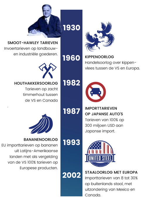 En dan hebben we nog de tonijnoorlog uit de jaren ‘70, het katvis-dispuut uit 2001, de handelsoorlog over GGO’s begin 2000, het eerste salvo handelstarieven onder Trump I,… De lijst met historische conflicten is heel lang. De opsomming in deze tekst is dan ook maar een erg beknopte greep uit enkele handelsconflicten die een impact hadden op de wereldhandel.